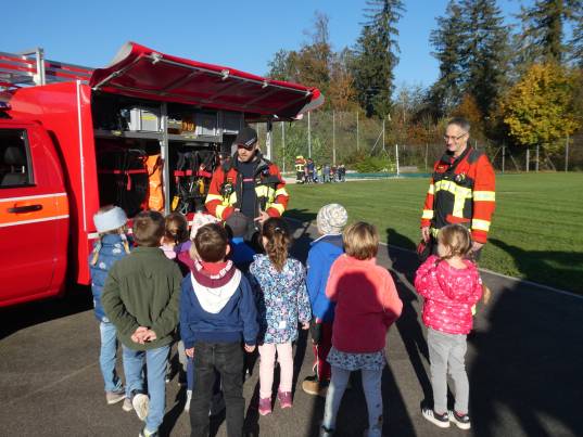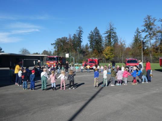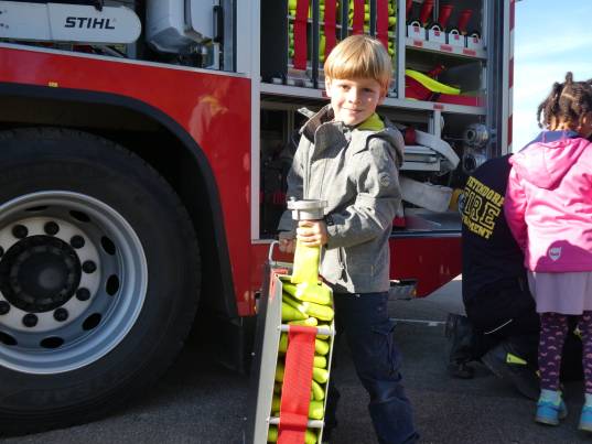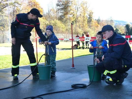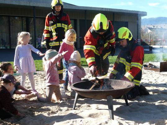 Die Kindergartenkinder erlebten unter der Leitung der Uetendorfer Feuerwehr einen interessanten und abwechslungsreichen Vormittag auf dem Schulgelände. An verschiedenen Stationen sammelten sie unterschiedliche Erfahrungen und durften sogar selber ein „brennendes“ Haus löschen.